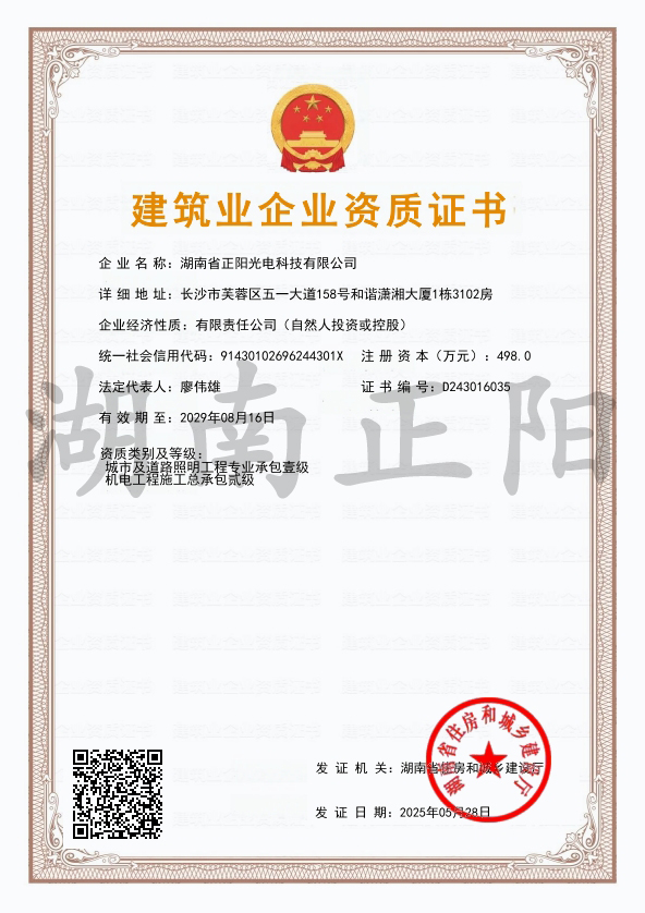 2025年4月8日,經(jīng)長沙市住房和城鄉(xiāng)建設(shè)局審核批準,湖南省正陽光電科技有限公司成功獲得“施工勞務”資...